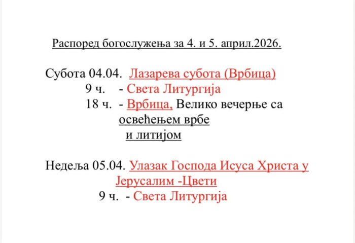 Svaka služba, svaki praznik, svaka sveća koja se upali u hramu Svete Petke u Bondiju nosi pečat ljubavi, truda i posvećenosti – i upravo zato ova parohija zaslužuje da bude veličana, poštovana i prepoznata kao jedan od najsvetlijih stubova našeg naroda u dijaspori. Zato sa ponosom prenosimo kompletan raspored bogosluženja za april 2026. godine, uključujući Lazarevu subotu, Cveti, Strastnu sedmicu i Vaskrs.