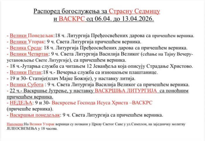 18 h – Napomena: Vernici su pozvani u Crkvu Svetog Save u ulici Simplon na zajedničku molitvu Jeleosvećenja