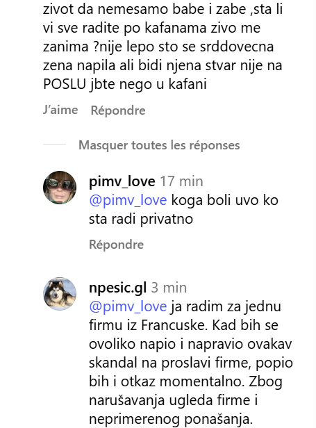„Radim za firmu iz Francuske. Kad bih se ovoliko napio i napravio ovakav skandal na proslavi firme, dobio bih otkaz momentalno – zbog narušavanja ugleda kompanije i neprimerenog ponašanja.“