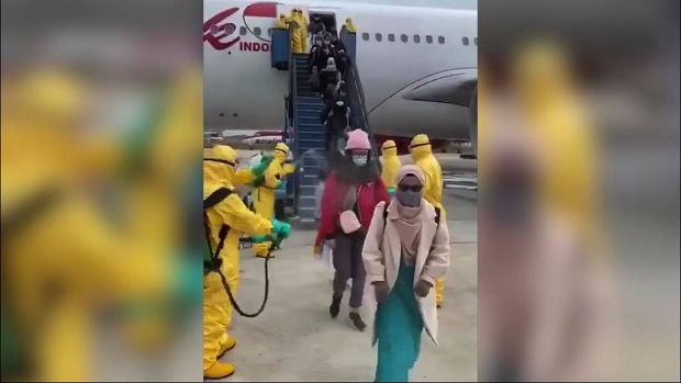 Na snimku možete videti putnike koji izlaze iz aviona, reklo bi se jedne Indonežanske avio kompanije. Svi su oni nose maske i izlazeći iz aviona silazeći niz stepenice, dočekuju ih ljudi u maskiranim kombinezonima.