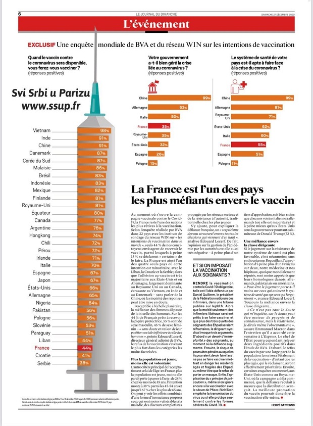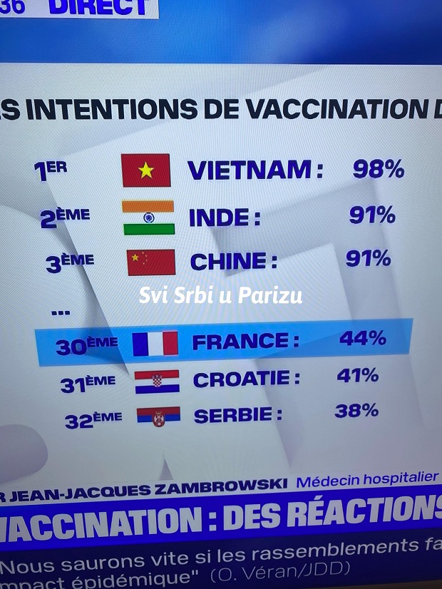 Dok  dve trećine Nemaca žele vakcinu, a Italijani skoro 70%, Francuza je samo 44% i nalaze se na tridesetom mestu. Iza Francuske na pretposlednjem mestu je Hrvatska sa 41% zainteresovanih za vakcinu, dok je na poslednjem mestu Srbija sa 38%.