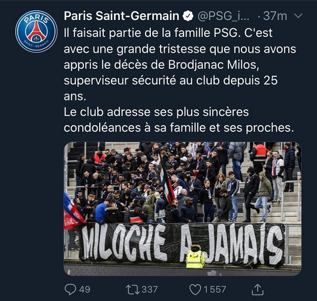 Fudbalski klub PSG je u svojoj objavi iznad fotografije na kojoj su navijači PSG-a postavili transparent sa njegovim imenom, napisao da : „Bio si član naše porodice. Sa velikom tugom smo saznali vest o smrti Brođanca Miloša, supervizora obezbeđenja punih dvadeset i pet godina. Klub izražava najiskrenije saučešće njegovoj porodici i najbližima“.