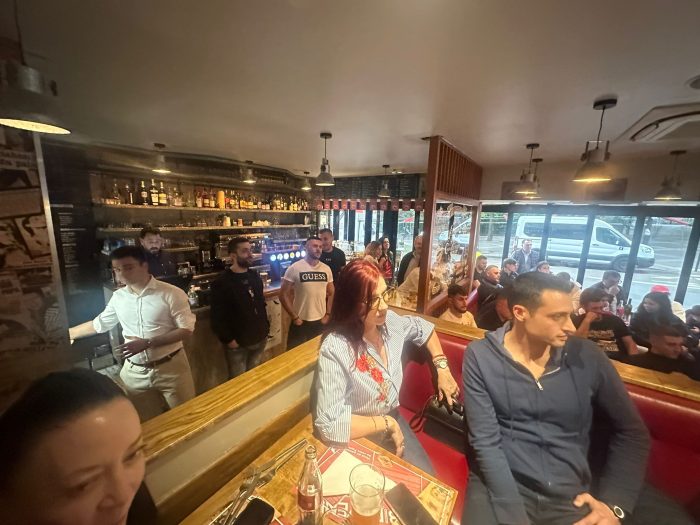 Kafić je bio prepun navijača koji su sa ponosom nosili srpske zastave. Među okupljenima su se mogli videti entuzijasti svih generacija, od najmlađih do najstarijih, svi sa zajedničkim ciljem – da podrže Srbiju.