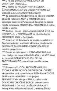 Pritisak na neposlušne pripadnike žandarmerije je veoma veliki pa po informacijama koje kruže, neki od njih dobijaju premeštaje posle 20.godina službe. To je na svom fb. profilu napisao Zdravko Rajević.