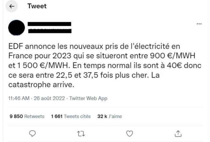 Lepi dani još nisu prošli a zima se već najavljuje kao veoma zabrinjavajuća. Toliko da je panika zavladala energetskim tržištem u Evropi. U petak, 26. avgusta, francuske cene su čak oborile rekorde. Međutim, prema rečima jednog korisnika interneta, ovaj dramatičan splet događaja će izazvati spektakularno povećanje francuskih računa za struju. Distribucija „EDF objavljuje nove cene električne energije u Francuskoj za 2023. koje će biti između 900 evra/MVH i 1.500 evra/MVH”, rekao je on, dodajući da se u „normalnim vremenima” megavat sat trguje po ceni od „40 evra”, piše TF1.